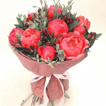 Букет из 9 пионов сорта Coral Sharm с добавлением голландского эвкалипта и альстромерий. Данный сорт пионов характеризуется тем, что быстро раскрывается.