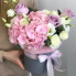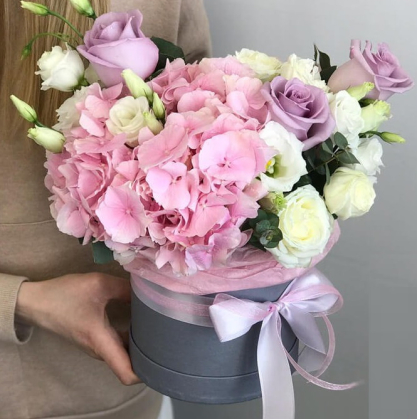 Шляпная коробка с гортензией, розами и лизуантусами | Купить в Железнодорожном