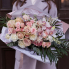 Букет из одиночных и кустовых роз, гвоздик, орхидей и маттиолы, с добавлением веток пальмы, экалипта и астильбы