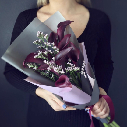 Букет из 9 фиолетовых калл с лимониумом | Купить в Железнодорожном