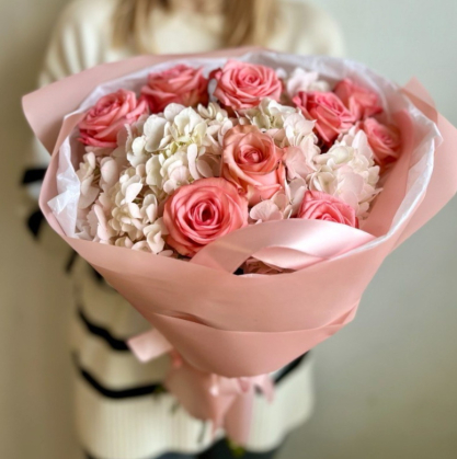 Розовые розы и белые гортензии в стильной упаковке