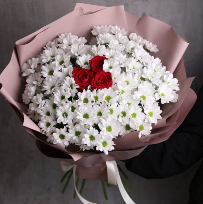 Букет хризантем с розами в центре | Заказать цветы в Железнодорожном