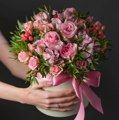 Букет в коробке из кустовых роз и альстромерии | Купить в Железнодорожном
