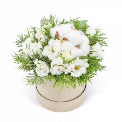 Аккуратная шляпная коробочка из эустомы, хлопка и пихты