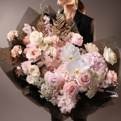 Потрясающий букет из пионовидных и кустовых роз, гвоздик, гортензий, орхидей, озотамнуса и аспарагуса, с добавлением папоротника и гиперикума в стильной упаковке