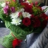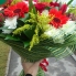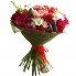 Эффектный, многгранный букет из красных роз, розовой и малиновой герберы, фиолетовых и красных альстромерий, красных тюльпанов, белых хризантем и солидаго с зеленью аралия,  в симпатичной упаковке с красной атласной ленточкой
