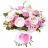 Восхитительный букет из фрезий, пионов, роз и эустомы с добавлением листьев салала. Упаковка матовая бумага.