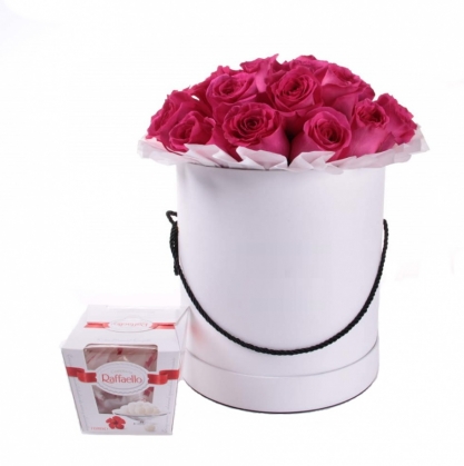Коробочка из ярко-розовых роз и конфеты Rafaello