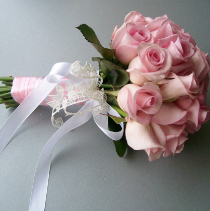 Букет с нежно-розовыми розами сорта Титаник. Бутоньерка и леспестки роз в подарок.