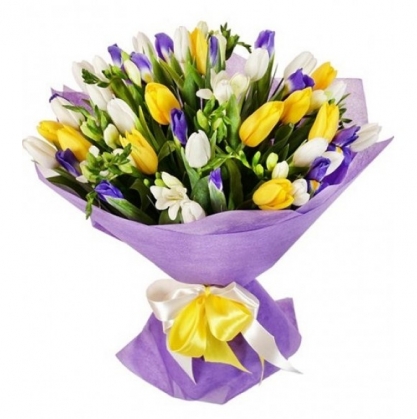 Букет "Три желания" из тюльпанов, ирисов и фрезии | Купить в Железнодорожном